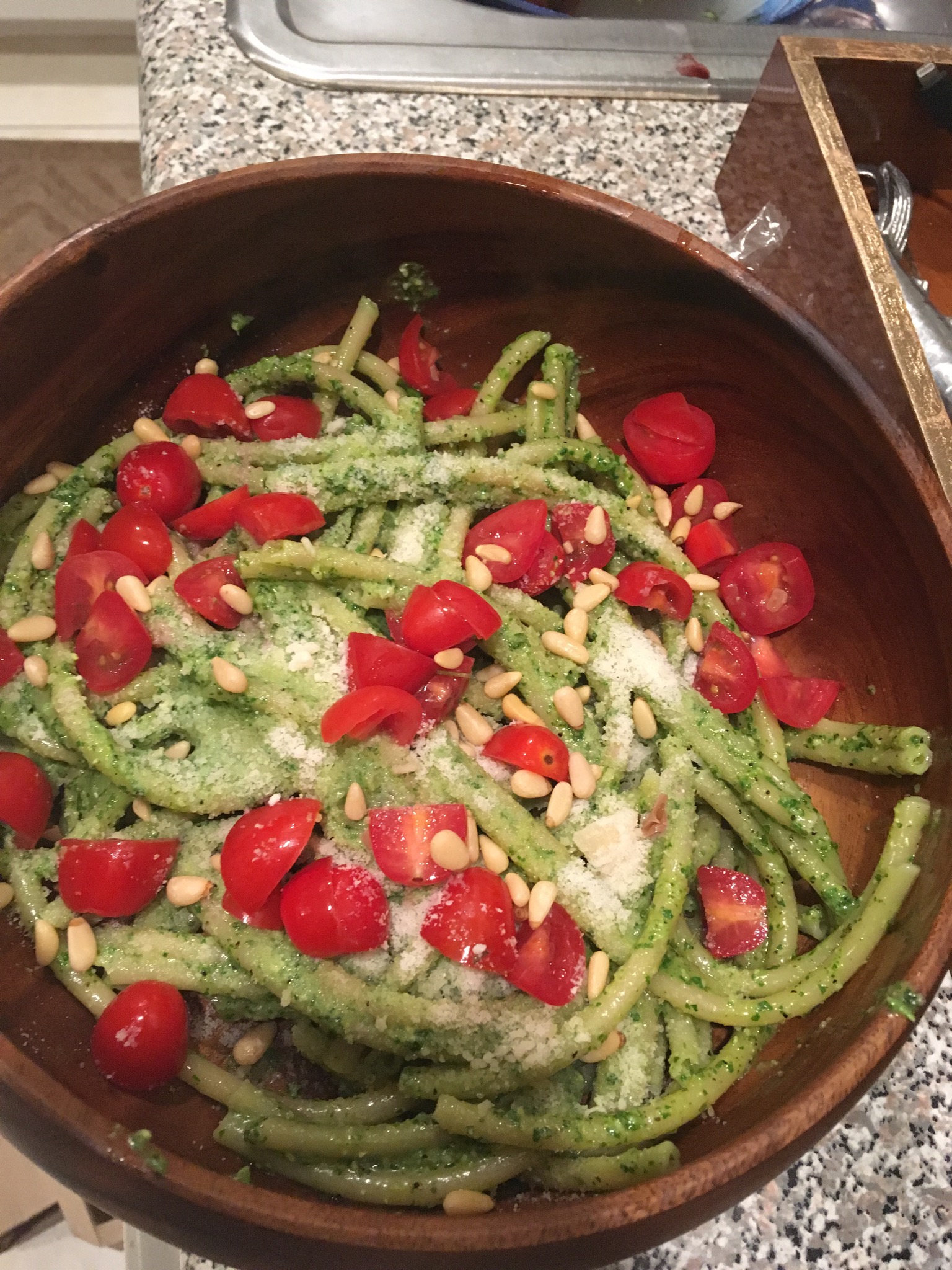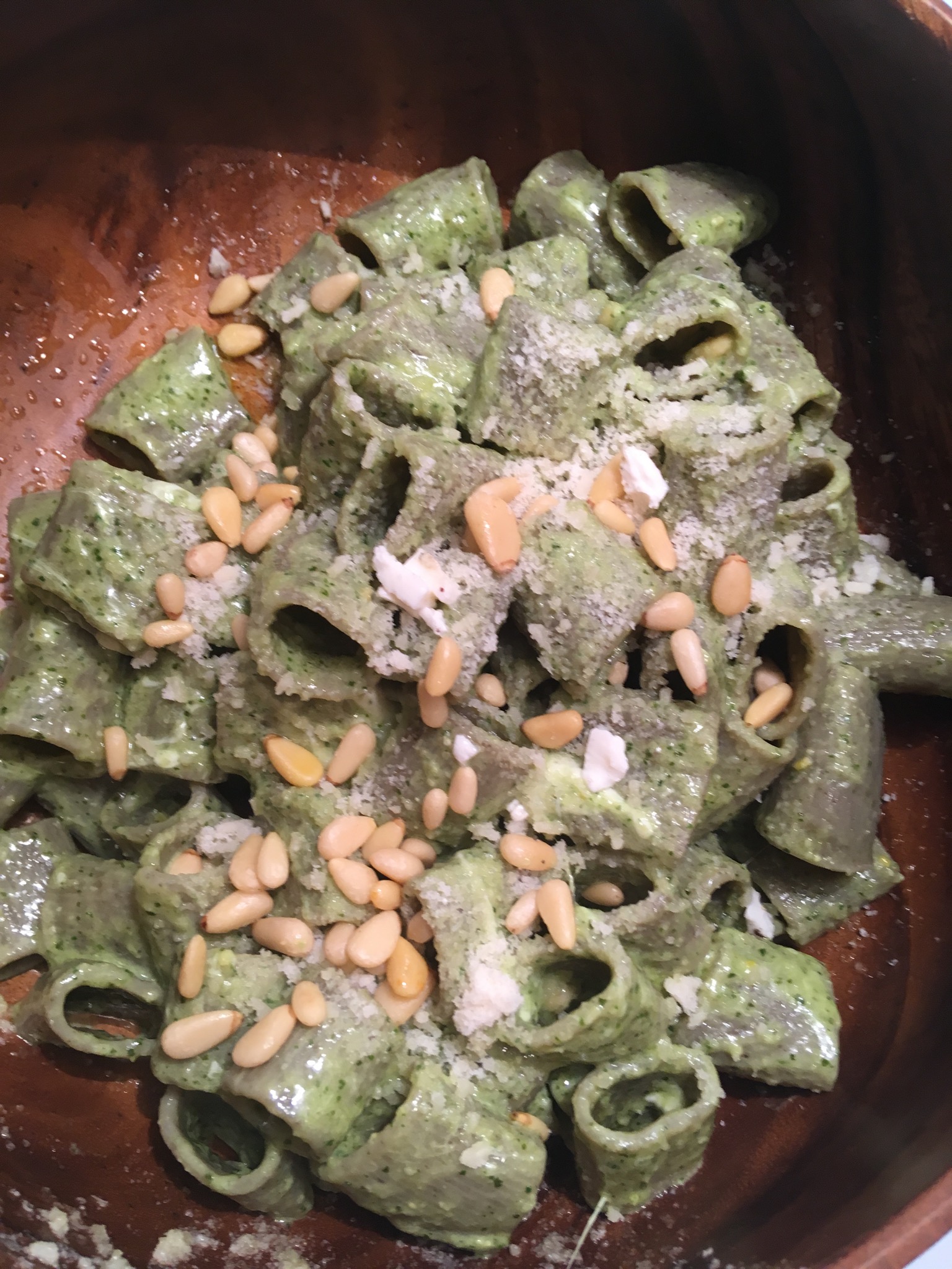 - The sauce: 1/2 basil, 1/2 arugula, garlic, sea salt, pine nuts, parmesan, olive oil. The pasta: Hemp rigatoni or spiral pasta. The wine: Cloudy Bay Sauvignon Blanc, New Zealand. This wine has just the right balance of light body and grassiness. It will compliment the herbaceous, plant-like quality of the sauce and pasta.